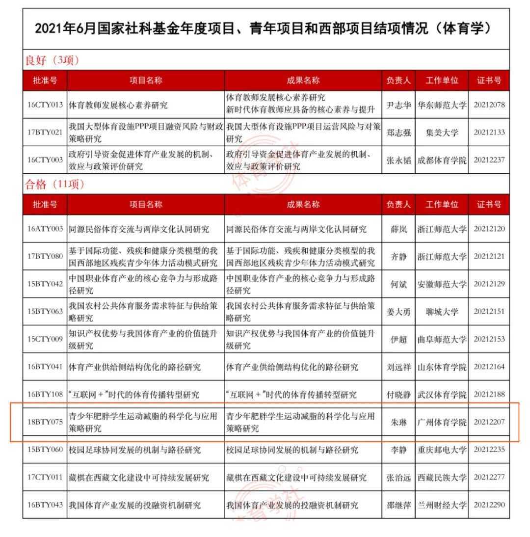 热烈祝贺由减肥达人携手广州体育学院珠江学者朱琳教授团队联合科研项目——《青少年肥胖学生运动减脂的科学化与应用研究策略》顺利结项。据悉,全国哲学社会科学工作办公室共验收369个年度项目、青年项目和西部项目结项申请。经同行专家鉴定评估后,306个项目予以结项,体育学类有14个项目结项。其中《青少年肥胖学生运动减脂的科学化与应用研究策略》是体育学类里以青少年科学减脂为研究主题的项目。
