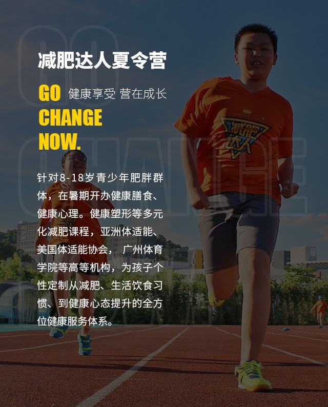 针对8-18岁青少年肥胖群体,在暑期开办健康膳食、健康心理。健康塑形等多元化减肥课程,亚洲体适能、美国体适能协会, 广州体育学院等高等机构,为孩子个性定制从减肥、生活饮食习惯、到健康心态提升的全方位健康服务体系。